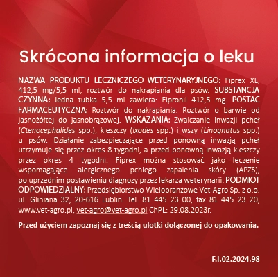Vet-Agro Fiprex XL 5,5ml to skuteczny preparat przeznaczony do zwalczania inwazji pcheł, kleszczy i wszy u psów powyżej 8 tygodnia życia, o wadze od 40 do 55 kg. Dzięki niemu możesz zapewnić swojemu pupilowi ochronę przed ponowną inwazją pcheł przez 8 tygodni oraz kleszczy przez 4 tygodnie.