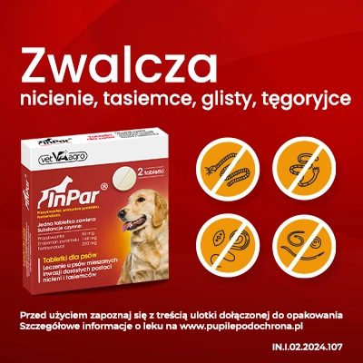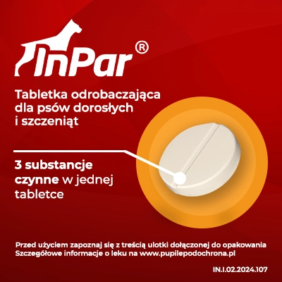Tabletki InPar to skuteczny preparat odrobaczający dla psów. Zawierają trzy aktywne składniki: Prazykwantel, Embonian pyrantelu oraz Fenbendazol, które efektywnie zwalczają pasożyty wewnętrzne, takie jak nicienie i tasiemce.