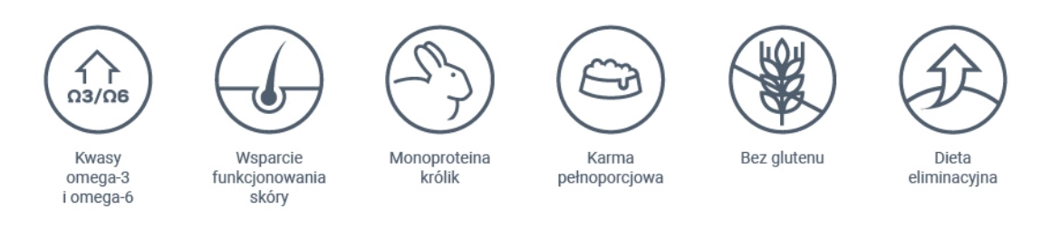 Karma zawiera 35% świeżego mięsa z królika oraz 20% suszonego mięsa z królika, co czyni ją źródłem wysokostrawnego białka. Ziemniaki jako źródło węglowodanów minimalizują ryzyko nietolerancji glutenu. Dodatkowo, zawiera niezbędne kwasy tłuszczowe omega-3 i omega-6, które wspierają zdrowie skóry oraz poprawiają jakość sierści.