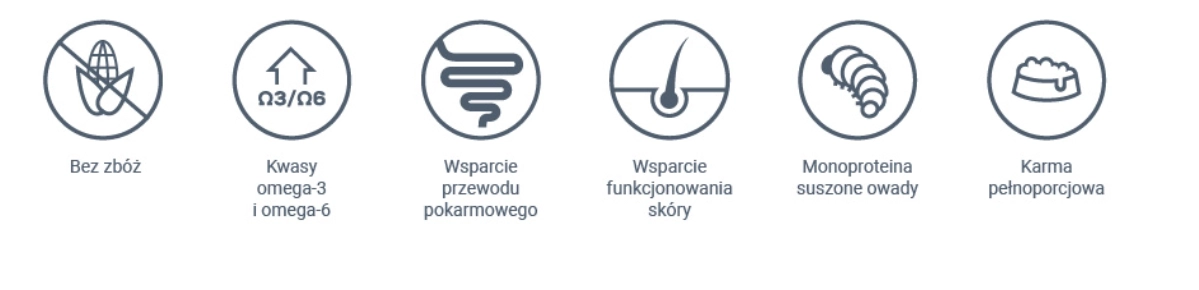 Karma Hypoallergenic Insect zawiera białko z larw owada Hermetia illucens jako jedyne źródło białka zwierzęcego. Dzięki temu minimalizuje ryzyko alergii. Węglowodany pochodzą z suszonych batatów i ziemniaków, co ogranicza ryzyko nietolerancji glutenu. Dodatkowo, karma wzbogacona jest w nienasycone kwasy tłuszczowe omega 3 i omega 6, które wspierają zdrowie skóry i sierści.
