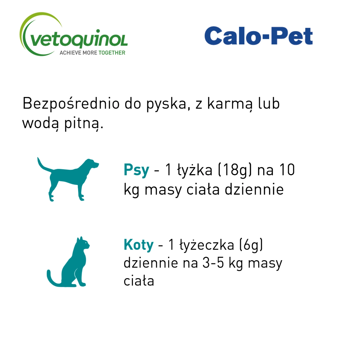 Dla psów: 1 łyżeczka (18 g) dziennie na każde 10 kg masy ciała. Dla kotów: 1 łyżeczka (6 g) dziennie dla zwierząt o masie 3-5 kg. Można podawać bezpośrednio lub zmieszać z karmą lub wodą.