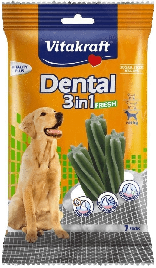 Unikalny, przysmak w kształcie sześcioramiennej gwiazdy, sprawia iż przysmak Vitakraft Dental 3w1 zapewnia i ułatwia dokładne czyszczenie zębów, wspiera usuwanie osadu i zapobiega odkładania się kamienia nazębnego. Dzięki specjalnemu kształtowi dodatkowo masuje dziąsła psa.