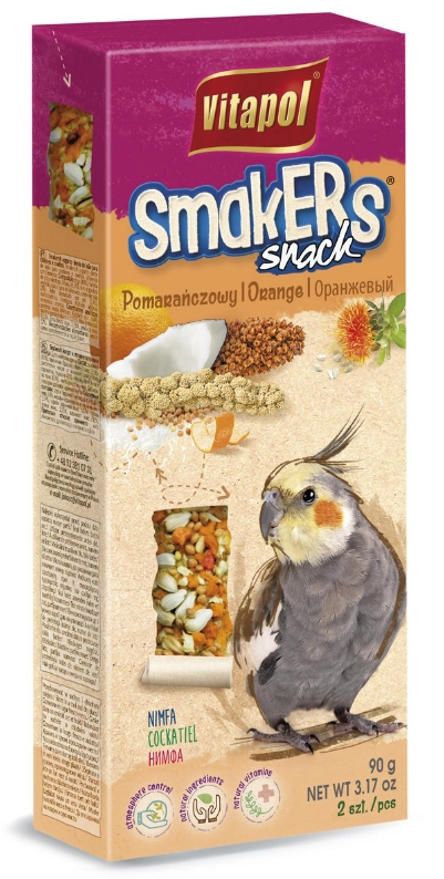 Vitapol Smakers Dla Nimfy Pomarańczowy 2szt to idealne uzupełnienie diety Twojej papużki. Te przekąski o smaku pomarańczowym dostarczają niezbędnych składników odżywczych, w tym flawonoidów, witaminy C i karotenu. Dzięki obecności pomarańczy, wspierają zdrowie ptaków, oferując właściwości przeciwzapalne i przeciwbakteryjne.