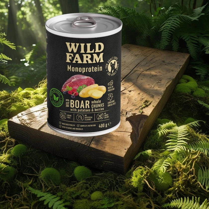 Wild Farm Monoprotein Wild Boar to pełnoporcjowa karma mokra opracowana z myślą o psach wszystkich ras, w szczególności tych o wrażliwym układzie pokarmowym lub zmagających się z alergiami. Formuła opiera się na jednym źródle białka zwierzęcego – dziczyźnie, która jest lekkostrawna, wartościowa i dobrze tolerowana nawet przez psy z nietolerancjami pokarmowymi.