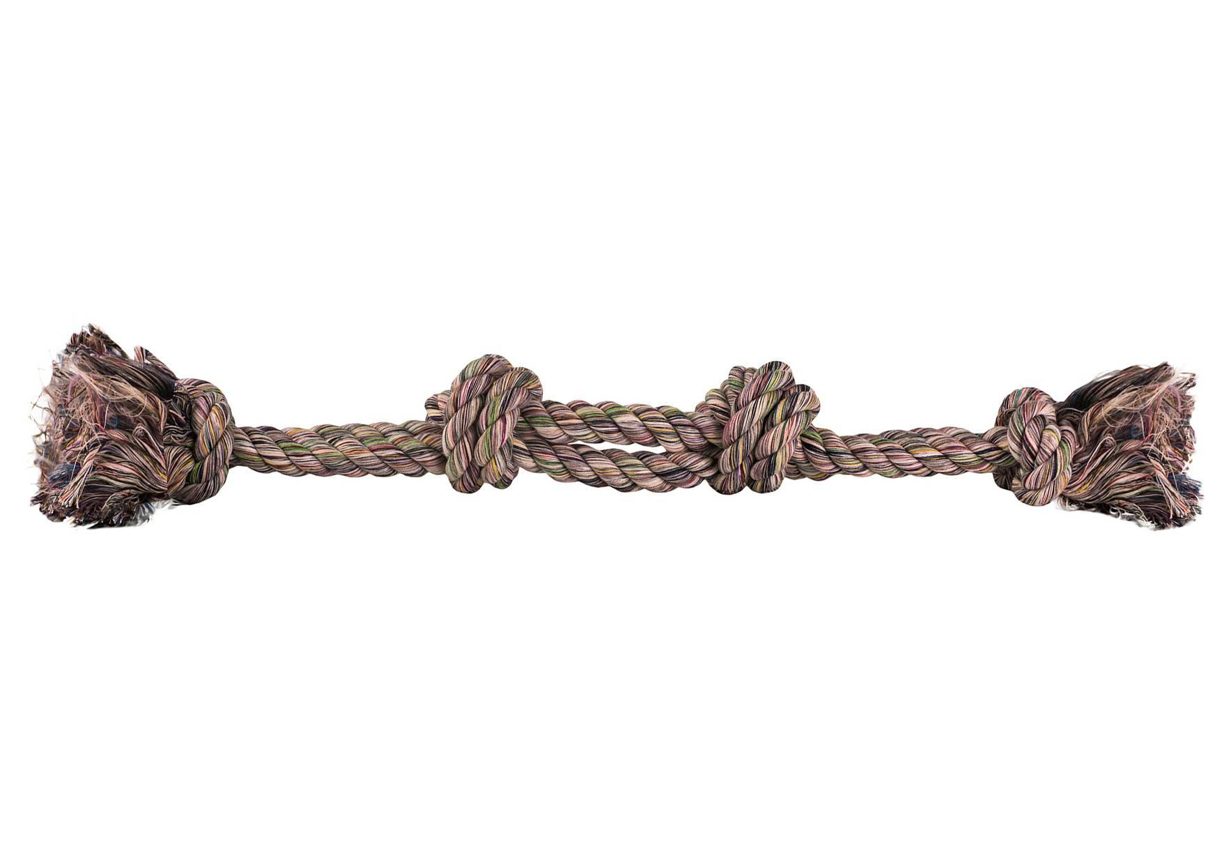 Coraz więcej psów zmaga się z nadwagą. Statystyki są miażdżące: nawet połowa psów posiada nadmiarowe kilogramy, zaś co trzeci futrzak jest otyły. Nadmierna waga ciała prowadzi do wielu komplikacji zdrowotnych, poczynając od problemów ze stawami, poprzez choroby serca, a kończąc na cukrzycy. Jeśli więc niepokoi Cię gromadzący się tu i ówdzie na ciele pupila tłuszczyk, z pewnością zainteresuje Cię sznur podwójny węzły 80 cm. Świetnie nadający się do zabaw w aportowanie i przeciąganie, pozwoli czworonogowi oraz jego właścicielowi spalić nadmiar spożytych kalorii. Gryząc i ciągnąc sznur, pies nie tylko mile spędza czas, ale też pozbywa się gromadzących się na dziąsłach i powierzchni zębów osadu i kamienia. Sznur wykonany z bawełny stanowi świetną alternatywę dla gryzaków, często bazujących na bogatych w tłuszcz podrobach.