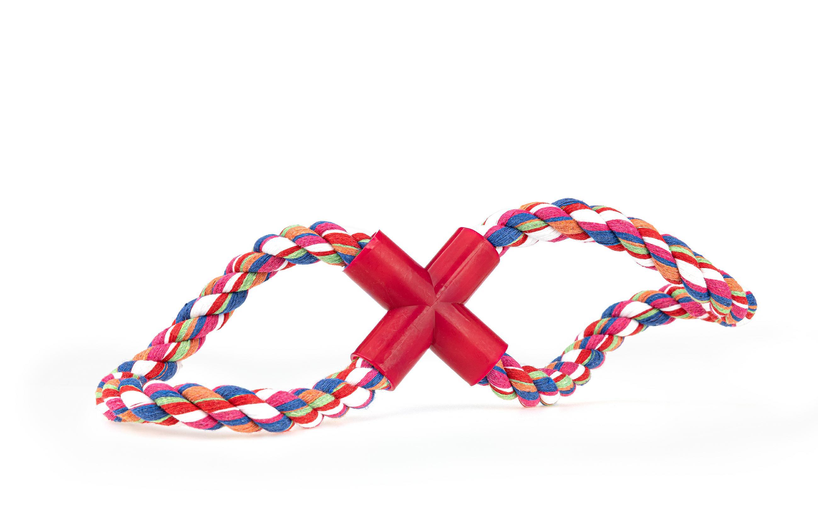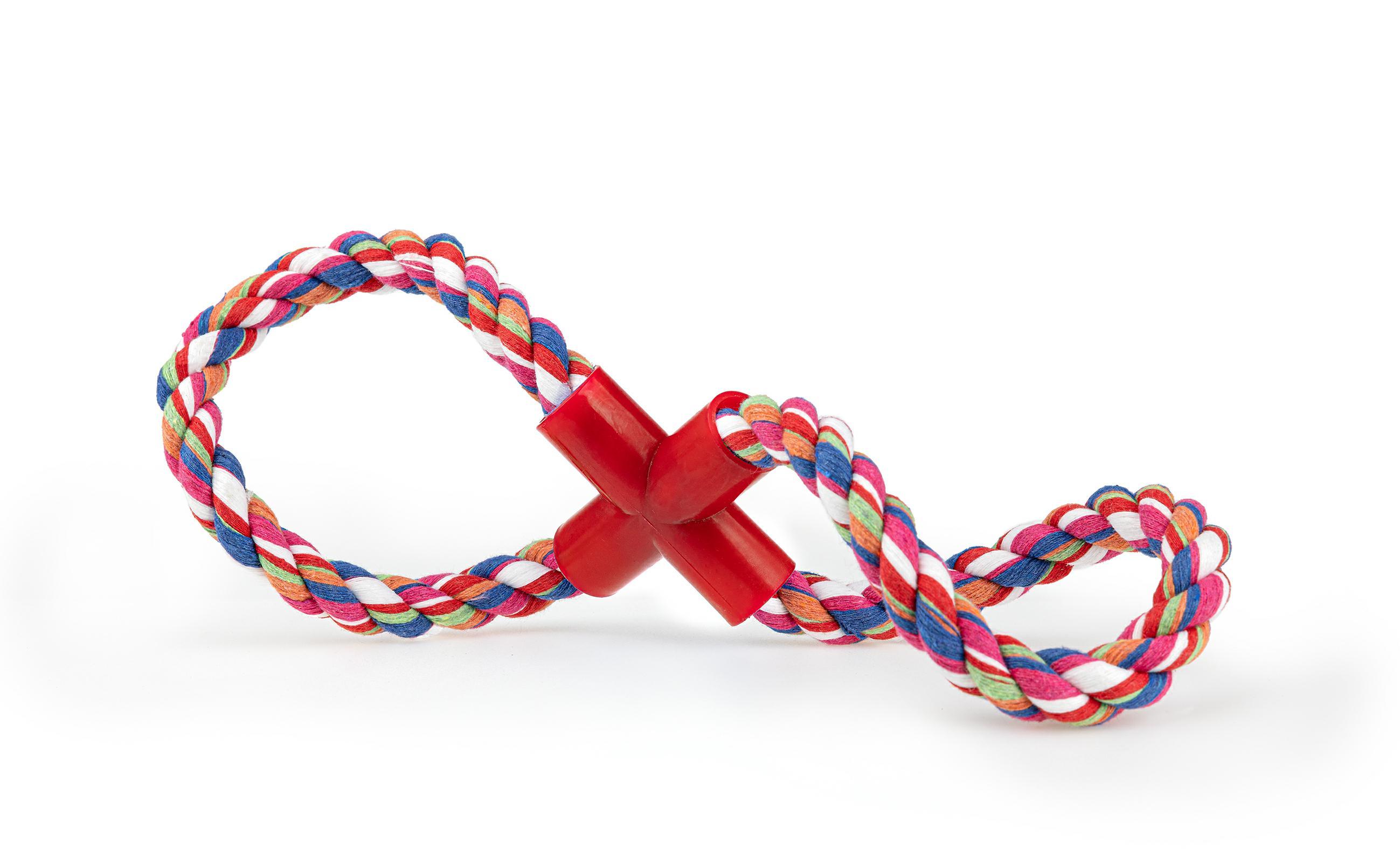 Zabawka sznurkowa w kształcie ósemki wykonana z wytrzymałego kolorowego sznurka. Solidna konstrukcja zapewnia długotrwałe użytkowanie, nawet podczas intensywnego gryzienia i szarpania. Dzięki specjalnemu splotowi, włókna sznurka skutecznie czyszczą zęby psa, wspierając higienę jamy ustnej. Zabawka doskonale nadaje się do aportowania oraz przeciągania, co umila czas oczekiwania na powrót właściciela. Przeznaczona dla dużych i średnich psów.