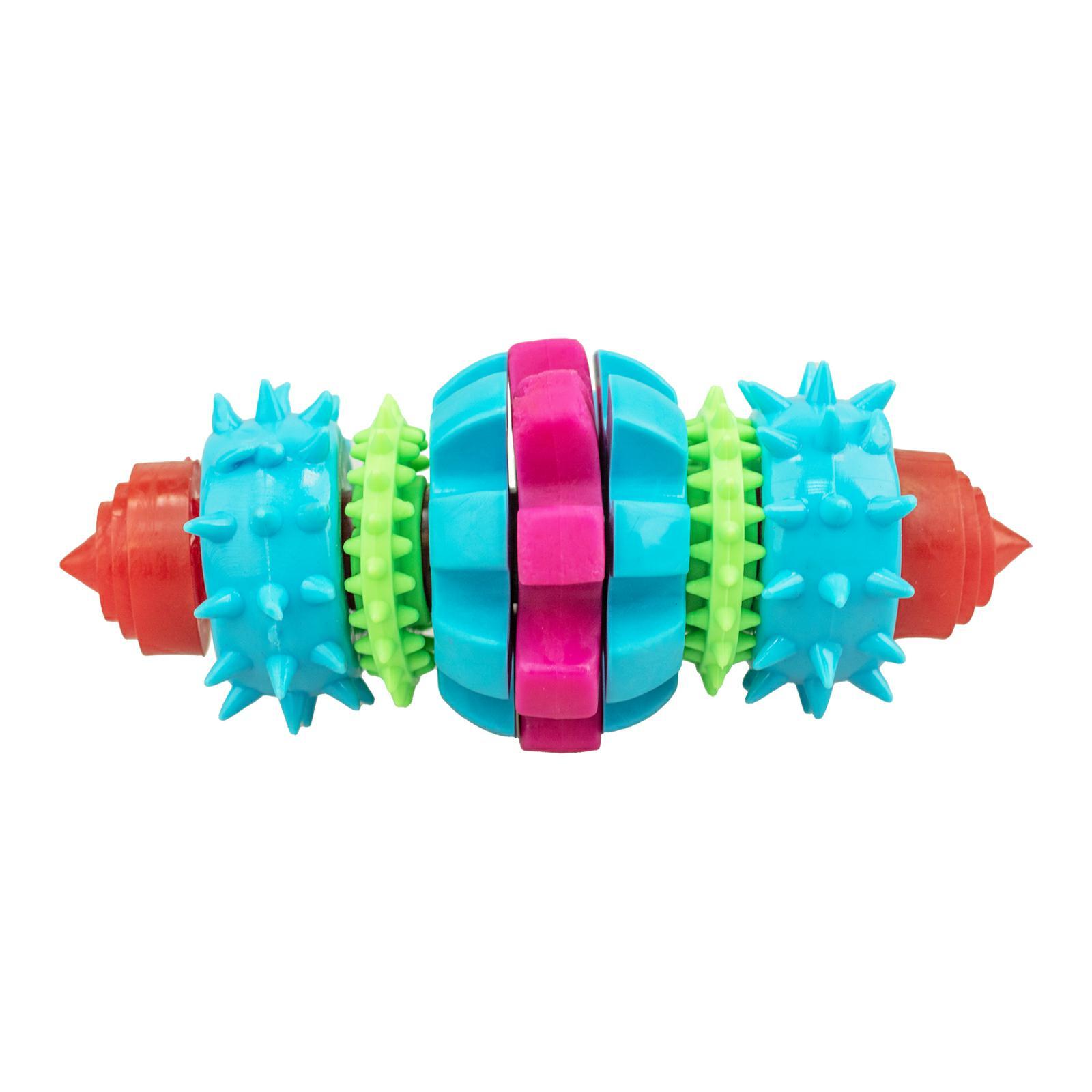 Zabawka wykonana jest z krążków gumowych o różnorodnej twardości i strukturze. Obracające się wypustki pomagają w utrzymaniu dobrego stanu uzębienia psa- doskonale masują dziąsła, czyszczą zęby oraz zapobiegają osadzaniu się kamienia nazębnego. Gryzak jest odpowiedni dla psów w każdym wieku, również szczeniąt. Wymiana uzębienia u szczeniąt (12-14 tydzień życia) jest etapem bardzo nieprzyjemnym– dziąsła bolą i swędzą, a zwierzę usiłuje złagodzić te dolegliwości gryząc różne przedmioty ze swojego otoczenia. Warto zadbać o komfort szczenięcia podsuwając mu zabawkę przynoszącą ulgę- można dodatkowo ją schłodzić.
