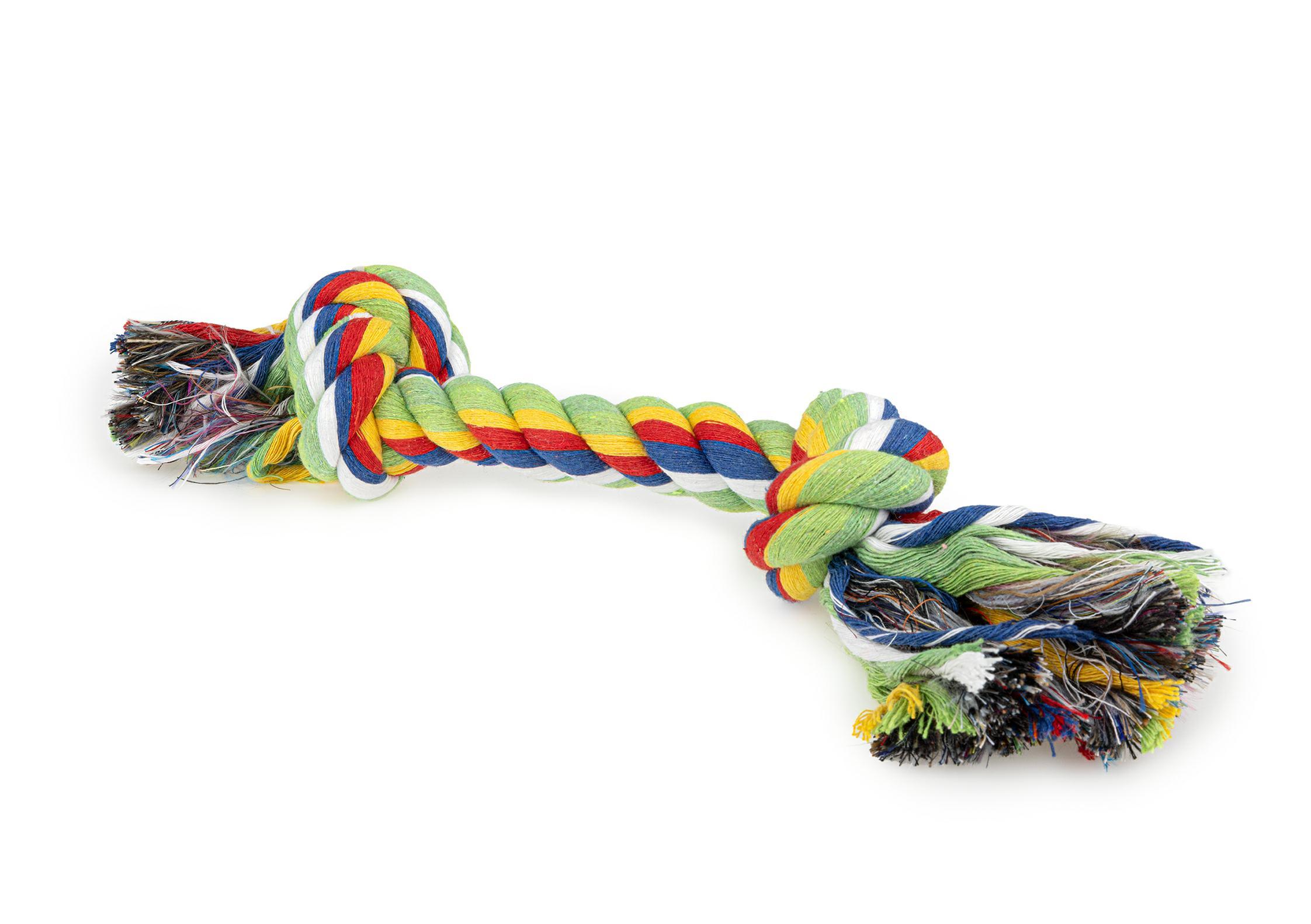 Oferujemy zabawkę sznurkową wykonaną z trwałego, kolorowego sznurka. Na obu końcach znajdują się mocne supły, które zapewniają solidność podczas zabawy. Zabawka przetrwa intensywne gryzienie i szarpanie, co przyczynia się do higieny jamy ustnej psa. Włókna sznurka dostają się między zęby, efektywnie czyszcząc je podczas żucia.