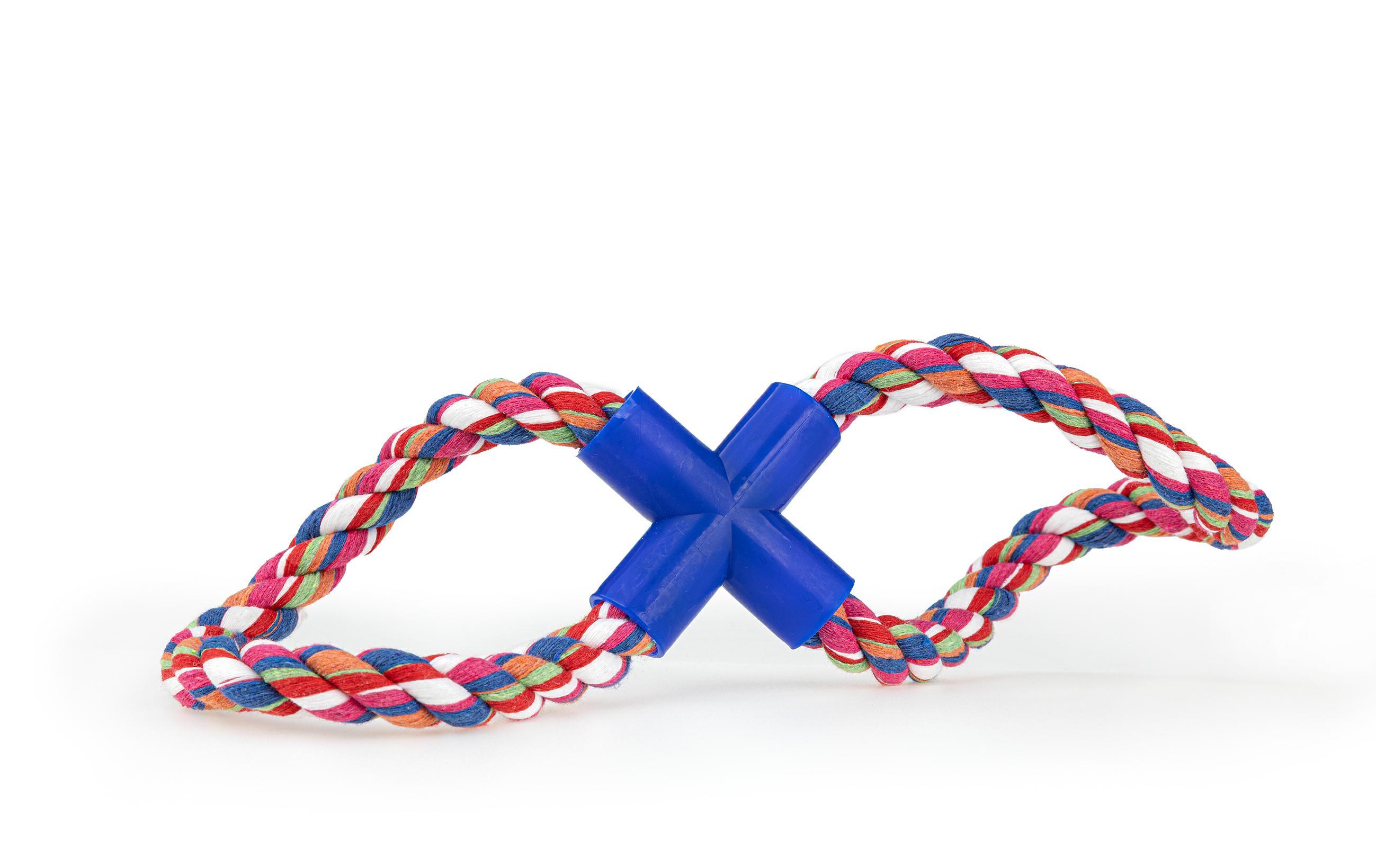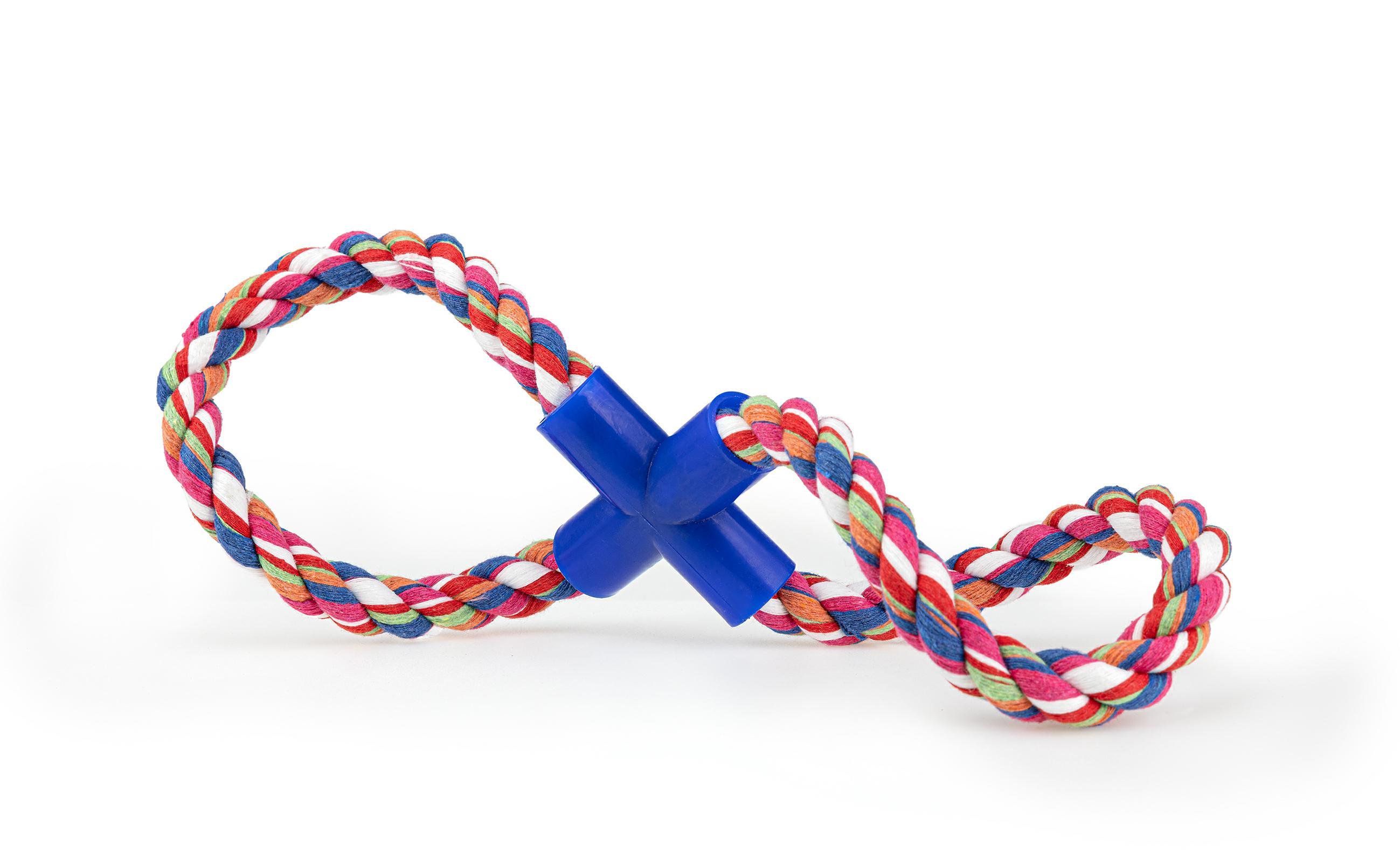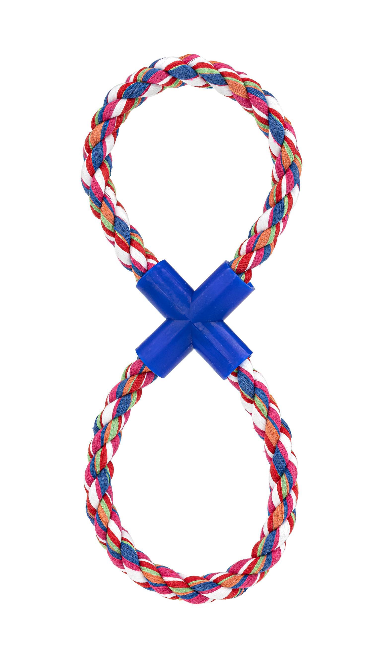 Ta wytrzymała zabawka wykonana jest z kolorowego sznurka, połączonego w kształt ósemki. Solidny splot sprawia, że z łatwością przetrwa intensywne gryzienie i szarpanie, co przyczynia się do higieny jamy ustnej pupila. Podczas żucia włókna dostają się między zęby, efektywnie je czyszcząc.
