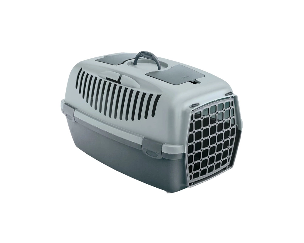 Bardzo wytrzymały, wykonany z trwałego, odpornego na zniszczenia, lekkiego plastiku. Ma estetyczny wygląd i staranne wykończenia. Między dnem a górą transportera znajduje się 5 mocnych zatrzasków z blokadą uniemożliwiającą przypadkowe otwarcie. Solidne, metalowe drzwiczki gwarantują całkowite bezpieczeństwo przewożonym zwierzętom. Kratki wentylacyjne po bokach zapewniają odpowiedni przepływ powietrza. W górnej części transporter posiada stabilny uchwyt do podnoszenia, otwory do założenia pasów bezpieczeństwa oraz zaczepy na pasek do noszenia na ramieniu (nie znajduje się w zestawie). Klatka transportowa Gulliver 3 jest idealna do przewozu małych lub średnich psów albo pary kotów lub kotów dużych ras.