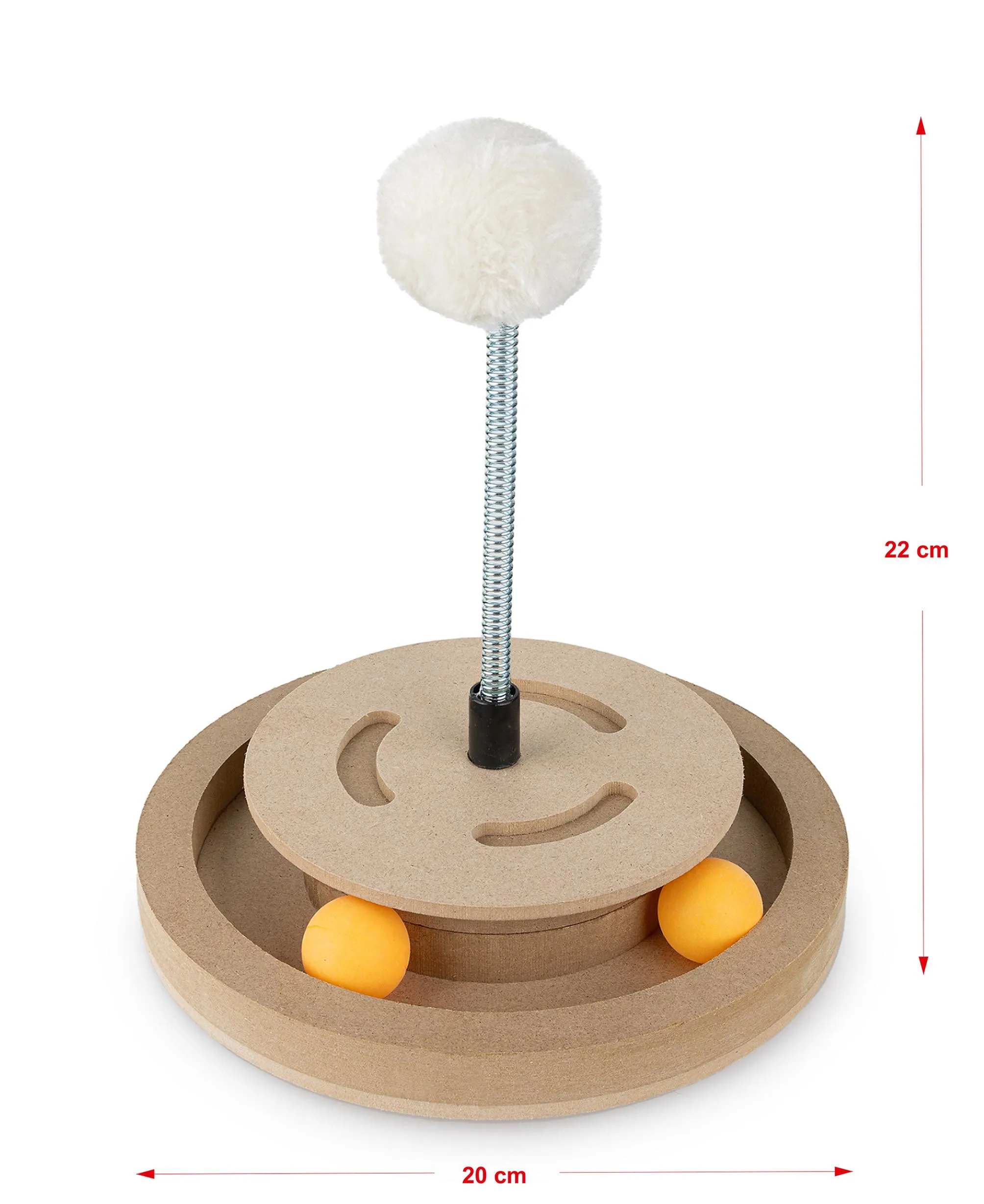 Ten produkt oferuje różnorodne formy aktywności. Zawiera piłkę połączoną ze sprężyną, która porusza się w różnych kierunkach, co zachęca kota do zabawy. Dodatkowo, w podstawie znajduje się tor z piłeczkami, co jeszcze bardziej urozmaica czas spędzany na zabawie. Taka aktywność nie tylko rozwija sprawność kota, ale również wpływa na jego samopoczucie i więź z właścicielem.