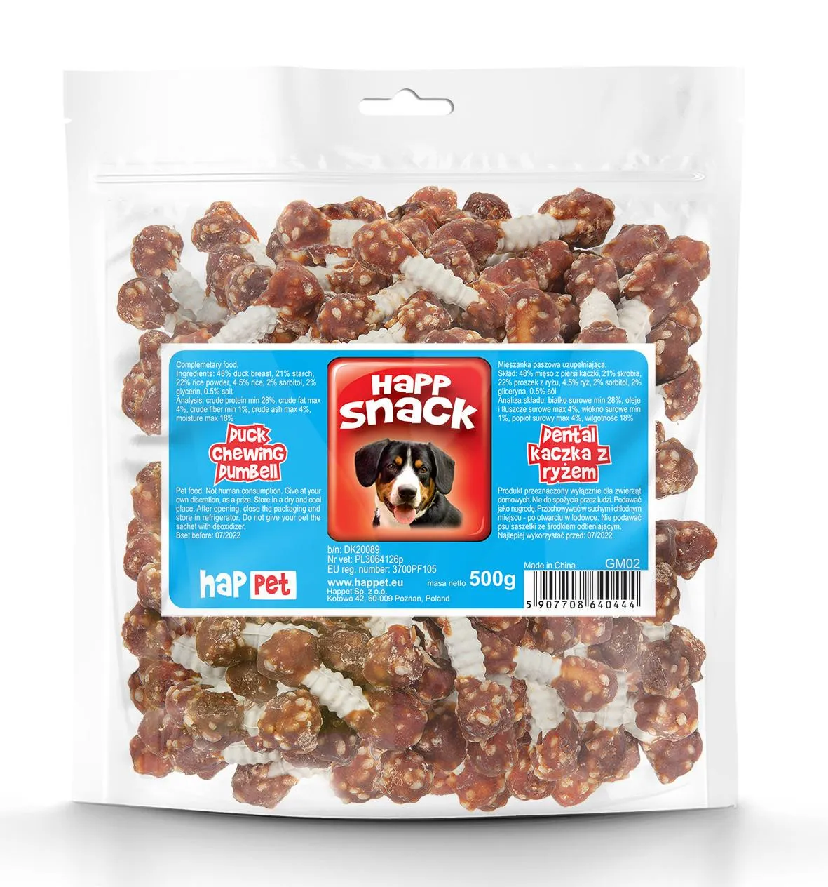 Skład: 48% mięso z piersi kaczki, 22% proszek z ryżu, 4,5% ryż, 2% gliceryna, 2% sorbitol, 21% skrobia, 0,5% sól.