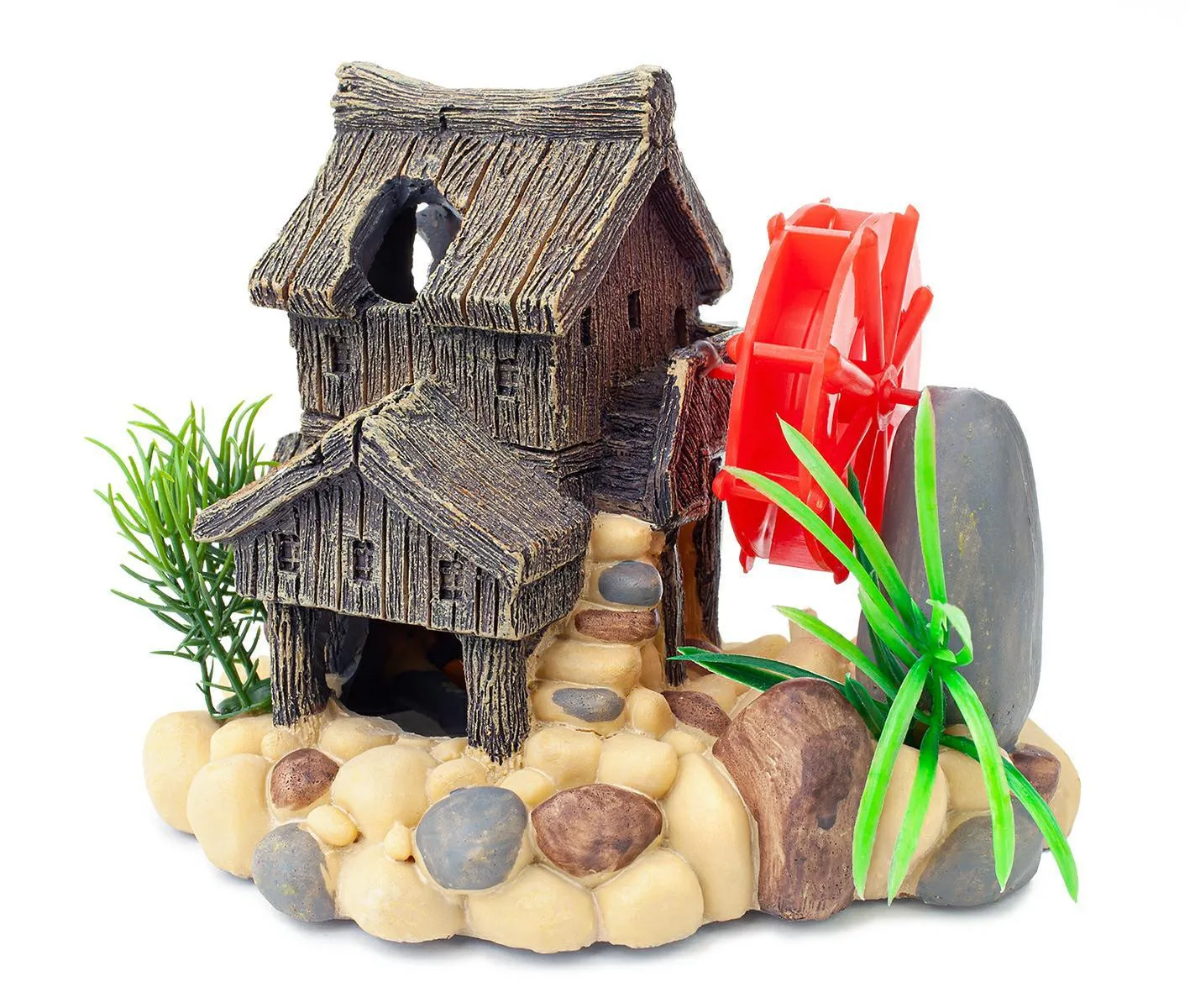 Urozmaicenie dla Twojego akwarium! Ozdoba akwariowa w kształcie domku z młynkiem wprowadza naturalny klimat do każdego zbiornika. Dzięki niej stworzysz przytulne miejsce dla swoich ryb, oferując im cień oraz doskonałe kryjówki.