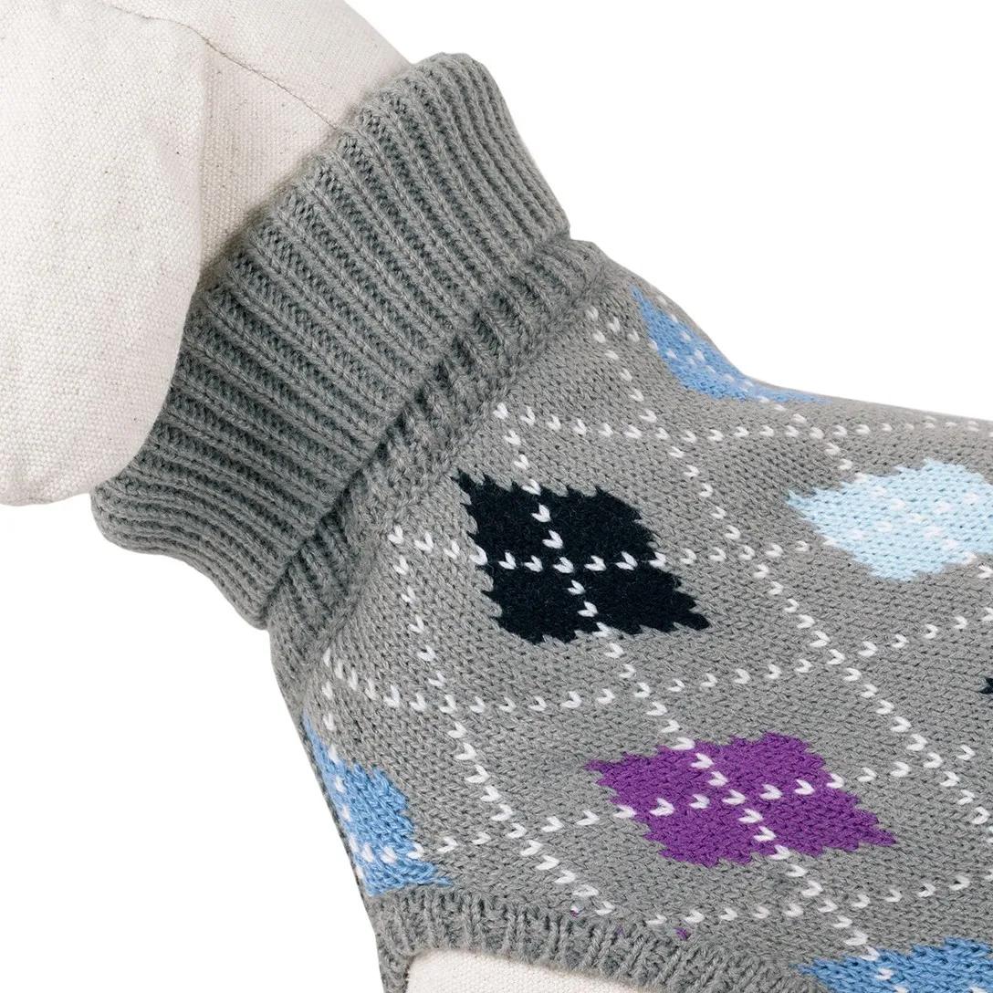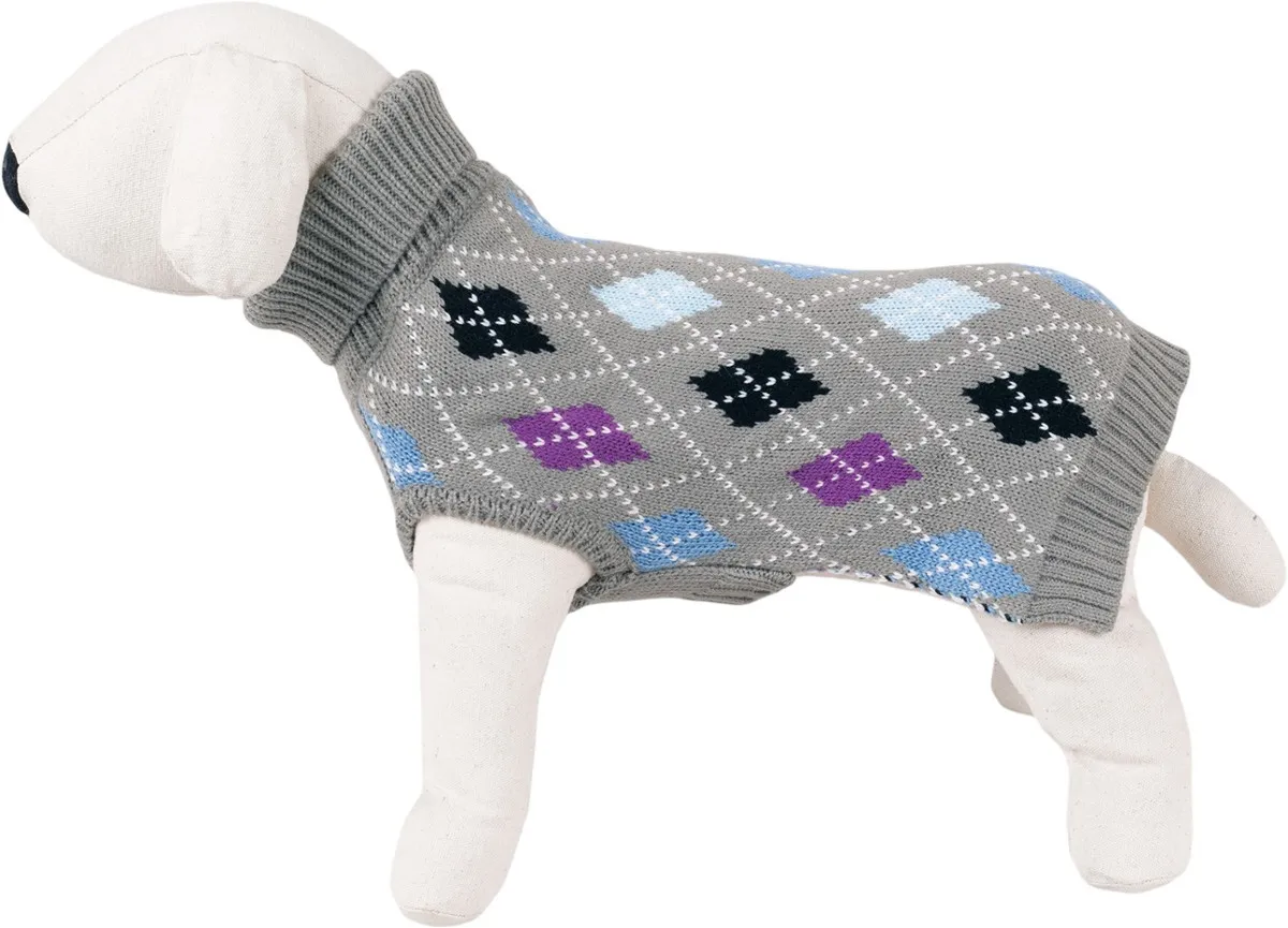 Sweterek w romby to idealny wybór dla Twojego pupila w chłodne dni. Wykonany z miękkiego i lekkiego akrylu, zapewnia doskonałą ochronę przed zimnem. Jego atrakcyjny szary kolor z elementami bieli, błękitu, czerni i fioletu sprawia, że Twój pies będzie wyglądał modnie.